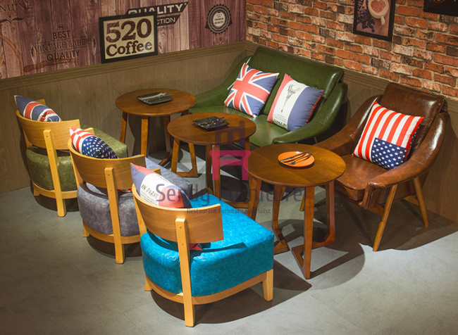This is a library style coffee house and restaurant. They choose yellow and blue leather for ILS-608 single sofa chair, matched with same maple color wood coffee table and book shelves. This single sofa chair set creats a warm and peaceful atmosphere. |
